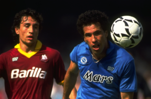 Non si arriva neanche al 5° di gioco che Nela ha già sbloccato il risultato su punizione inguagliando gli azzurri nella lotta scudetto a pari punti contro il Milan e la Roma riesce a giocare nella maniera che preferisce: 4-4-2 in linea con marcature a uomo e controgioco…lo 0-1 permane fino al 45°, quando Pellegrini (il marcatore di Maradona) incorre in 2 ammonizioni nel giro di pochi minuti e viene espulso; nel secondo tempo la superiorità numerica e il maggior tasso tecnico del 4-3-3 campano giocano il ruolo determinante e i padroni di casa riescono a ribaltare la partita segnando 3 gol in 20 minuti (52°-72°) di cui 2 (1° e 3°) su doppio rigore di Maradona e il punto del sorpasso firmato al 62° da Careca dalla linea di fondo su errore di Cervone…unica rete non segnata dagli 11 metri nelle 4 totali dei 2 scontri diretti fra le compagini di quell’anno.