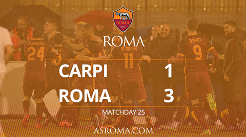 “È stata una partita difficilissima, ricordiamo le prestazioni del Carpi contro Inter e Fiorentina, abbiamo messo dentro qualità, ho visto una buona Roma e sono molto contento. Bisogna saper interpretare più modi di stare in campo perché ciò fa parte del calcio moderno, i miei colleghi usano questi princìpi e noi dobbiamo farlo, non è una cosa rigida è solo scivolare da un modo a un altro, i giocatori hanno modo di leggere e interpretare determinate situazioni di gioco come stasera, i miei terzini hanno spinto forte e creato i presupposti per il gol e affinché trovassimo la linea difensiva più scoperta e poi ho visto molte cose importanti e fatte di qualità che abbiamo nel nostro DNA. Dzeko? Lui è abituato a un gioco diverso, lui fa un movimento un po’ contrario, fa questa rotazione ad aprire sul secondo palo, è una caratteristica che ha usato in Inghilterra, è una scorciatoia che non abbiamo usato benissimo ma lui ci ha dato la sua risposta. Noi nello stretto abbiamo fatto delle buone triangolazioni ma possiamo ancora alzare il ritmo e magari evitare il gol, che però ci ha dato la conferma della reazione e questo è un punto a favore. Abbiamo un grande portiere, questa sera sembrava un centrale difensivo, Vainqueur anche ha dato una spinta fondamentale, Pjanic si è fatto trovare nella maniera giusta, sono convinto che nella prossima partita mostreremo lo stesso spirito. La nostra squadra inizia dal centro del campo e arriva alla punta della Curva Sud, se loro ci sono siamo fortissimi, così saremo al 100%, spero che lo capiscano”.