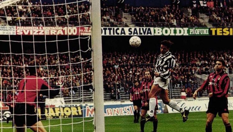 Da subito si nota che le assenze di Carrera, Torricelli, Del Piero sono state meglio assorbite rispetto a quelle di Maldini, Savicevic poiché il tridente bianconero mette a più riprese in difficoltà la retroguardia rossonera finchè non arriva il fatidico minuto 43: Di Livio, dalla destra, rientra sul sinistro e crossa per Baggio che anticipa di testa (non proprio il suo colpo prediletto) Costacurta e raggiunge Platini a quota 104 gol con le zebre appena prima che l’arbitro mandi tutti negli spogliatoi.