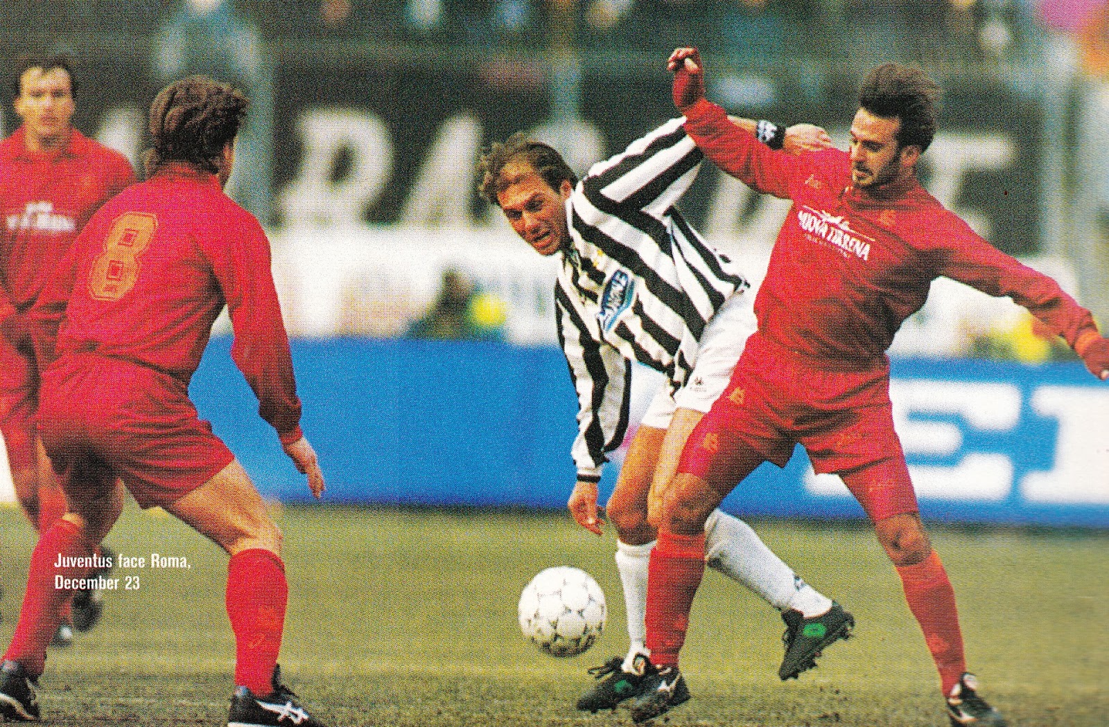 Tanti gli uomini in odore di nazionale per gli europei inglesi dell’anno dopo: Peruzzi/Torricelli/Di Livio/Ravanelli/Del Piero da una parte con Moriero/Carboni dall’altra…capitolo a parte meritano le stelle di “Italia 1990” come i capitani Vialli-Giannini, ormai fuori dalle grazie di mister Sacchi mentre sono stati solo 2 i presenti a “Usa 1994”, ovvero Conte con l’indisponibile Roberto Baggio…per quanto riguarda i giocatori di altre federazioni, in attesa di vedere il già citato transalpino Deschamps con lo stopper teutonico Kohler, troviamo il portoghese Sousa (che assieme all’altro veterano di 4 anni prima Ferrara, sarebbero dovuti venire a Trigoria in estate ma virarono verso il Piemonte causa la guerra fra Moggi e Sensi…) assieme al terzino croato Jarni al netto di un trio sudamericano formato dallo stopper brasiliano Aldair e dal duo di punte Balbo (argentino)-Fonseca (uruguagio) ricordando pure lo svedese out Thern (sopracitato pure lui).