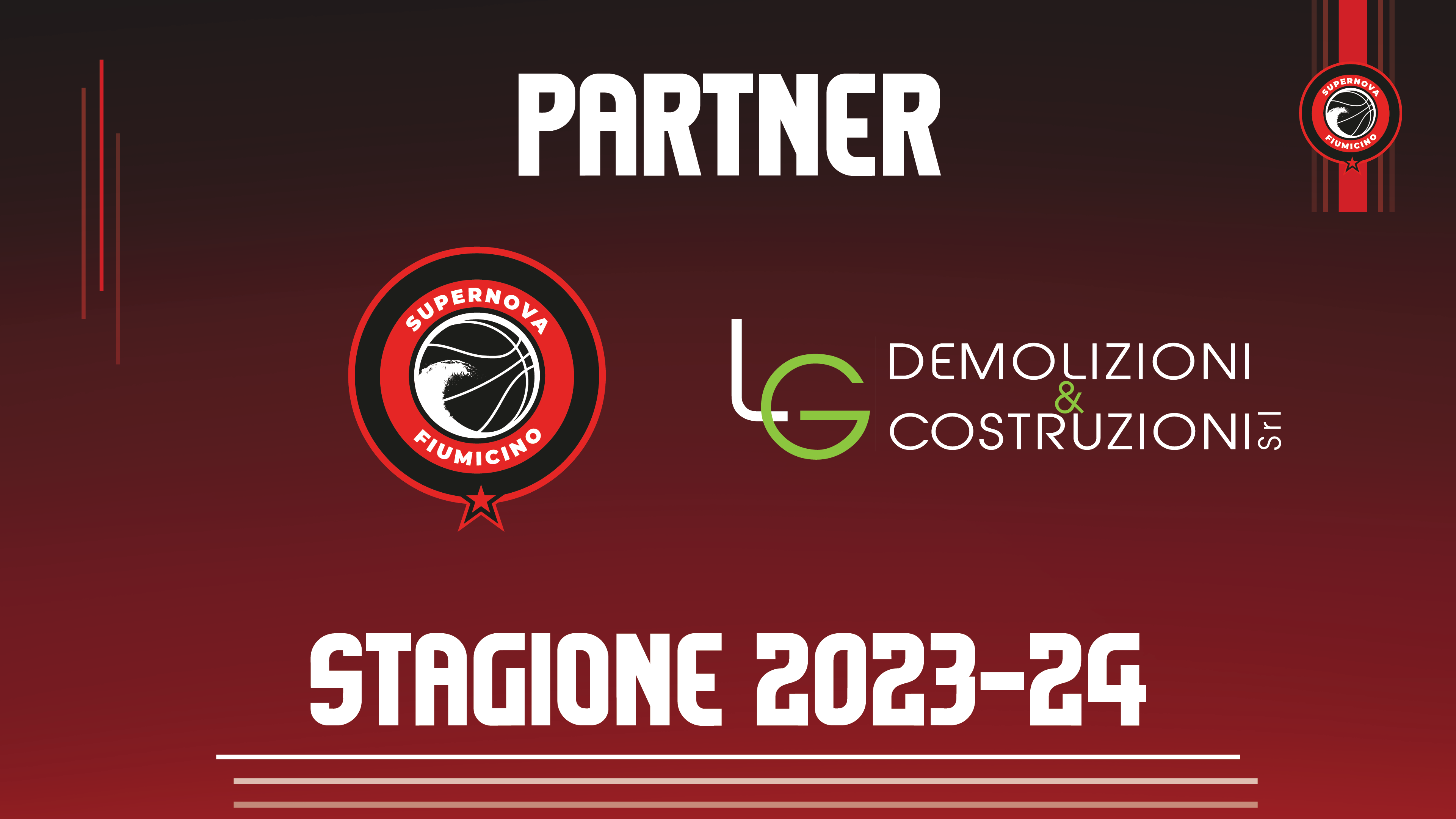 La famiglia rossonera si allarga, sempre di più. La Supernova Fiumicino annuncia con massima soddisfazione di aver siglato un accordo di partnership con la rinomata azienda L.G. Demolizioni e Costruzioni srl. La L.G. fa il suo debutto nel mondo della pallacanestro scendendo al fianco della Supernova in occasione della storica partecipazione al campionato di Serie B Interregionale.