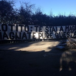 STRISCIONI E DIECI SACCHI DI LETAME – I destinatari dei messaggi sono ben definiti: Lotito e la squadra. Il primo striscione è per il presidente della Lazio: “Te stai a magnà tutto, magnate pure questa”. Il secondo per i giocatori: “Nella m***a volete farci affogare, ma prima ve la facciamo mangiare”. I motivi della contestazione sono gli investimenti estivi della società ritenuti insoddisfacenti e i risultati deludenti che hanno condotto la Lazio al 12esimo posto in classifica. Le cause individuate dalla tifoseria per spiegare questa situazione erano state anticipate in mattinata, con la diffusione di un comunicato ufficiale sulle frequenze della trasmissione radiofonica “I laziali sono qua”: “Dopo undici anni possiamo affermare, con assoluta certezza, che dietro questo comportamento c’è un presidente in malafede che merita di restare solo. Al secondo posto la squadra colpevole, oltre che di scarso impegno, di non essersi mai schierata al fianco di una tifoseria colpita da una repressione senza precedenti. Tifoseria che, durante tutta la scorsa stagione, le era stata vicino dentro e fuori lo stadio. Inoltre abbiamo dovuto ascoltare, dopo sei mesi di silenzio e indifferenza, un nostro giocatore lamentarsi della scarsa affluenza di pubblico (il riferimento è a Marchetti, ndr), come se vivesse su un altro pianeta, mentre il capitano della Juventus, Gigi Buffon, manifestava solidarietà e vicinanza ai tifosi della Lazio per la situazione che stanno vivendo”.