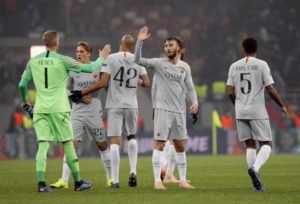 epa07149124 Players of AS Roma celebrate after winning the UEFA Champions League Group G soccer match between CSKA Moscow and AS Roma at Luzhniki Stadium in Moscow, Russia, 07 November 2018. EPA/YURI KOCHETKOV