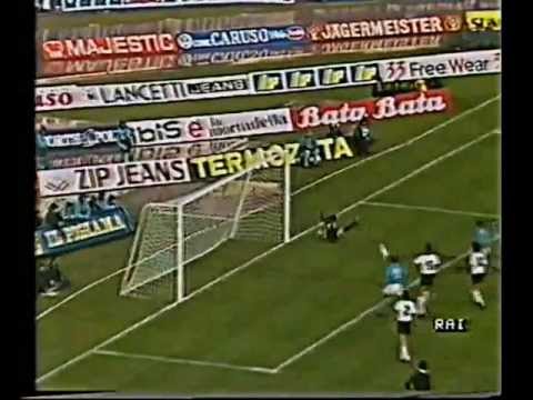 Il “San Paolo” ribolle di passione con 80.000 presenti fra cui neanche 1000 interisti e i presidenti Corrado Ferlaino con Ernesto Pellegrini si presentano in anticipo volendo vedere il primo la sfida da bordocampo e secondo dalla tribuna riservata ai VIP. La partita l’hanno studiata bene ambo gli allenatori: Bruscolotti-Rummenigge, Ferrario-Altobelli, Bagni-Matteoli, De Napoli-Fanna, Romano-Piraccini da un lato con Bergomi-Giordano, Ferri-Carnevale, Baresi-Maradona dall’altro mentre i portieri cercano di ribaltare l’azione nel più breve tempo possibile, Ferrara dà spunti supplementari per i suoi sulla sinistra senza dimenticare il duo Passarella-Mandorlini contro Renica a impostare dal basso…ne viene fuori un primo tempo in cui Maradona può segnare 2 volte in apertura ma trova sempre l’opposizione di Zenga prima di infrangersi sul palo sinistro su punizione a giro e dopo ancora Zenga salva su di lui mentre l’Inter resiste compatta rinunciando quasi del tutto al contropiede in modo da farsi vedere solo con un tiro da fermo spedito fuori col mancino da Passarella; Zenga é in grandissima giornata e salva ancora sia sul destro di De Napoli che sul sinistro di Giordano bloccando a terra mentre Rummenigge riesce a liberarsi una sola volta di Bruscolotti pur concludendo fuori di destro…e mentre Maradona costringe Baresi a seguirlo fino al centrocampo arretrando di 10 metri il suo raggio d’azione per consentire più libertà a Carnevale oltre a inserimenti più frequenti per Giordano, ecco che Romano tenta ancora di sinistro costringendo l’estremo difensore nerazzurro a distendersi ancora.