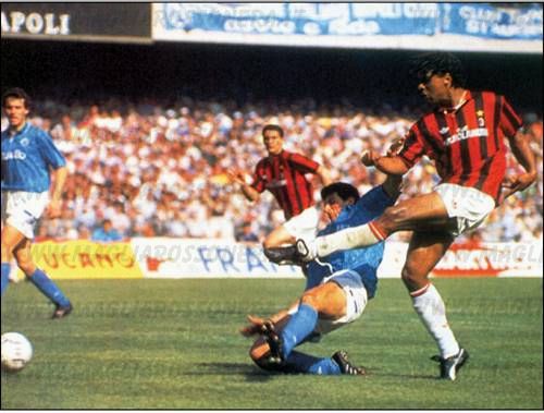 Ranieri, per l’occasione e sapendo di dover fare a meno sia del suo regista brasiliano Alemao oltre al terzino-mediano De Agostini, sfodera un 5-3-2 basato sul controgioco e le marcature individualizzate in cui vediamo spiccare il libero della Francia Blanc, che uscirà ai gironi insieme all’Inghilterra dietro alla Svezia padrona di casa e alla rivelazione Danimarca (per i transalpini 1-1 con la Svezia, 0-0 con l’Inghilterra, sconfitta 1-2 coi Danesi nel gruppo A), che porterà a casa la coppa dopo aver estromesso in semifinale l’Olanda del trio milanista Rijkaard-Gullit-Van Basten ai rigori per 5-4 in seguito al 2-2 maturato sul campo per poi superare 2-0 la prima Germania riunificata…la Danimarca non avrebbe neanche dovuto partecipare, ma subentrerà al posto della Jugoslavia, a cui era stata appena sciolta la federazione e squalificata da ogni competizione ciascuna rappresentativa sportiva; sul piano dei sudamericani vediamo solo il bomber carioca Careca al netto di un gruppo di uomini importanti che il nuovo tecnico italiano Arrigo Sacchi (protagonista delle grandi sfide fra Napoli e Milan di pochi anni addietro) sceglierà per le qualificazioni ai mondiali statunitensi del 1994: Zola e Tassotti, Costacurta, capitan Baresi, Maldini, Donadoni, Albertini, Massaro mentre chi aveva giocato nel 1982 e 1986 come Giovanni Galli o nel 1990 tipo Ferrara, De Napoli e Ancelotti sarà lasciato a causa intanto che altri come Francini o Fuser, Simone avevano chiuso la carriera in nazionale all’europeo del 1988 e alle olimpiadi seguenti di Seul. Capello usa sempre lo stesso assetto: 4-4-2 in linea sfruttando la “zona” già usata da Sacchi ma con una maggiore stabilizzazione in copertura attraverso un centrocampo più basso e una difesa che specula di più sul fuorigioco in modo da rendere compatti i reparti e da esentare il tandem offensivo da eccessivi compiti di ripiego…é fuori per scelta tecnica il giovane attaccante Cornacchini e gli infortunati sono lo stopper Filippo Galli oltre all’ala mancina Evani con il centravanti Serena ma la rosa é in condizioni smaglianti malgrado la stagione lunga e i risultati continui con l’obiettivo di dover chiudere quanto prima il discorso scudetto facendo leva anche sul roboante 5-0 dell’andata in cui erano volati insulti pesanti soprattutto fra le tifoserie, tra cui striscioni anche molto forti tipo “DAI QUARTIERI SPAGNOLI AI CAMPI FLEGREI, VESUVIO REGALACI UN’ALTRA POMPEI”, “MILANO IN FIAMME? E POI VOI DOVE ANDATE A LAVORARE?”, “SE NAPOLI E’ LA CITTA’ DEL SOLE, MEGLIO LA NEBBIA” di cui i napoletani non si scordano e rispondono con lanci di oggetti ai tifosi avversari intanto che si fa spazio in Curva B la scritta “IL VESUVIO IL REGALO VE LO PUO’ ANCHE FARE, MA POI LE VOSTRE MAMME DOVE VANNO A…” alludendo a uno dei mestieri più antichi del mondo in un periodo in cui l’odio territoriale italiano stava toccando pesanti picchi di esasperazione anche grazie al proselitismo di partiti secessionisti come la “Lega Nord”, che attecchiva soprattutto in regioni come la Lombardia.