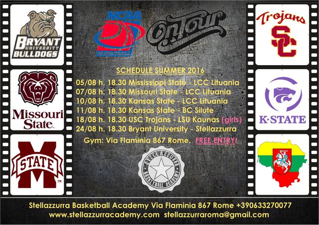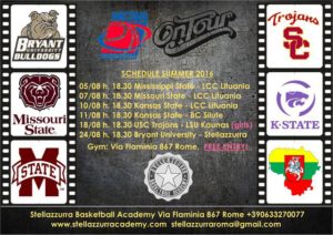 Sul parquet stellino di Via Flaminia arriveranno Mississippi State, formazione militante nella Southeastern Conference (SEC), Missouri State, che compete nella Missouri Valley Conference (MVC), Kansas State, squadra della Big 12 che vanta 5 partecipazioni nelle ultime 7 stagioni al Torneo NCAA del quale ha giocato la Final Four per quattro volte nella sua storia, e Bryant University, membro della Northeast Conference (NEC) che sarà l’avversaria dei padroni di casa della Stella Azzurra Academy nella gara di mercoledì 24 agosto che chiuderà il tabellone delle amichevoli NCAA all’Arena Felici. Dove saranno presenti anche le squadre lituane del BC Silute, club della seconda serie nazionale del Paese baltico, e della LCC International University di Klapeida. Nel tabellone della NCAA On Tour anche il match femminile tra le Trojans di Southern California e le lituane della LSU Kaunas.