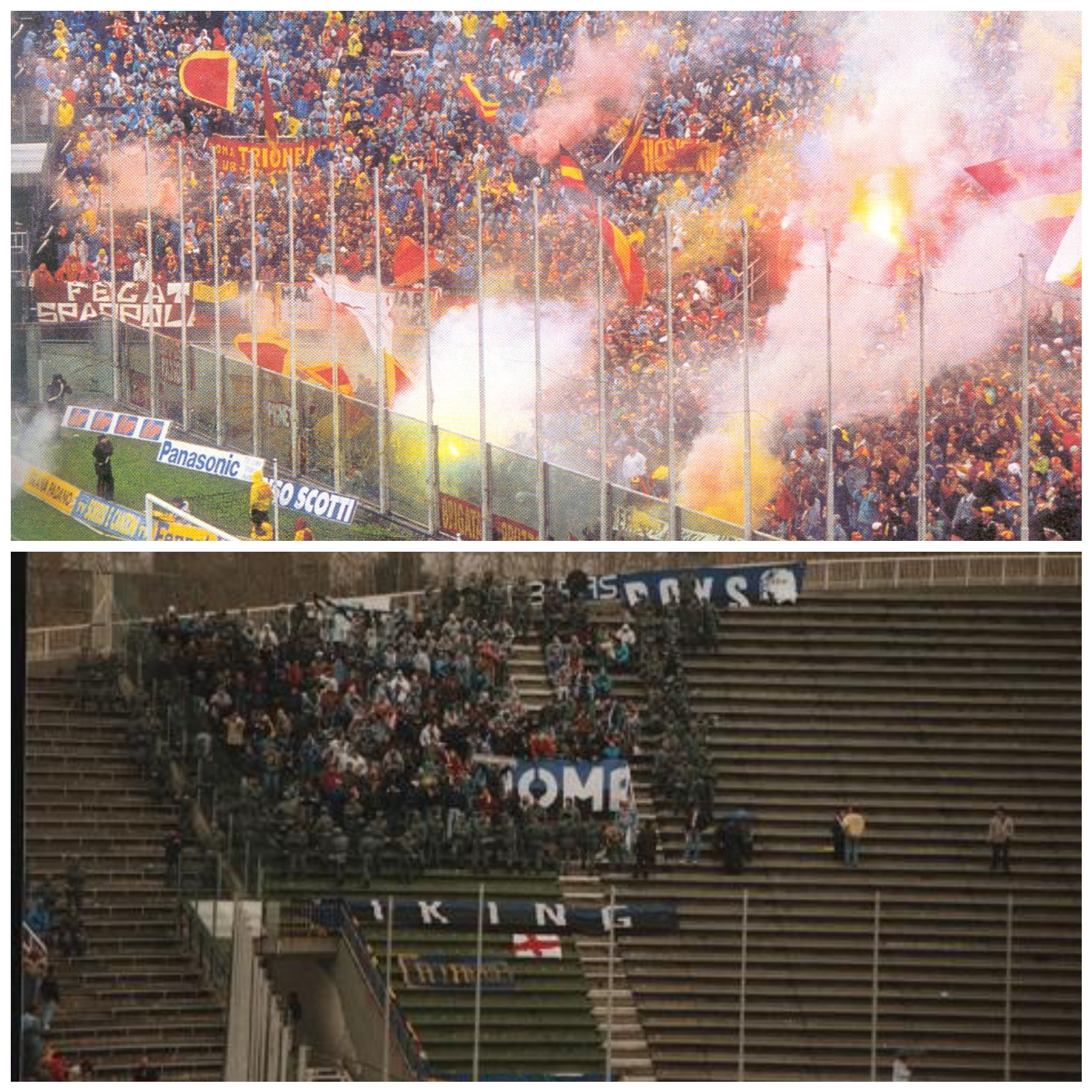 Al “Flaminio”, casa delle capitoline per quest’annata causa la ristrutturazione dell'”Olimpico” in vista dei mondiali, piove e fa freddo ma non basta: la polizia è impegnata fin dalle prime ore del mattino a dover presidiare il tragitto che va dalla stazione “Termini” fino allo stadio per garantire che gli appena 100 interisti in trasferta (fra i quali un gruppo di Catania ed uno di Roma) non creino o diano problemi…è la prima volta che una compagine milanese viene a giocare in casa dei lupacchiotti dopo l’omicidio del giovane tifoso Antonio De Falchi ad opera di teppisti milanisti il 4/6/1989 nel pre-gara di Milan-Roma 4-1 e i supporters della capitale hanno fatto intendere che non importano i colori poichè la ferita è ancora aperta; succede così che, alla fine, i 100 ospiti vengono isolati nella parte alta della “Tribuna Tevere” trovandosi accerchiati da almeno 100 agenti della celere oltre che lontanissimi dal resto dei 25.000 presenti…decisamente un clima da guerriglia che anticipa quello che succederà 14 giorni dopo in occasione di Roma-Milan 0-4 ma che, in realtà, non porterà a disordini di rilievo bensì solo ad un’accanita battaglia verbale fatta di sfottò o minacce.