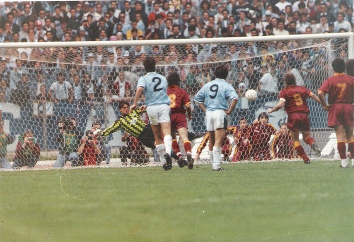 Quando parte la ripresa Piacentini rileva Salsano ponendosi come mediano delegato a seguire Troglio e facendo scalare Gerolin sulla sinistra; è il 53° mentre Carboni va via sulla sinistra venendo arpionato da Bacci in “zona penalty” con conseguente indicazione del dischetto ed Ammonizione da parte di Pairetto: Voller non perdona e realizza l’1-0 a “cucchiaio” con il destro sotto la “Nord”…alla Lazio allora saltano i nervi a cominciare da Sclosa che, già ammonito poco prima, molla un colpo proibito a Berthold ottenendo il II° giallo al 55° facendosi poi seguire da Solda’ e Desideri quando corre il 60° nonché poco dopo che Rizzitelli aveva rischiato di farsi buttare pure lui per aver regolato un vecchio conto con Gregucci in maniera molto poco ortodossa da cui si era salvato solo con il giallo: il primo tenta di decapitare lo stesso Berthold con una gamba tesa ad altezza testa e il secondo va a fare giustizia da solo per il compagno (inutilmente). Ormai le occasioni si susseguono instancabilmente da una parte e dall’altra con la Roma che potrebbe chiudere il conto da un momento all’altro mentre Bertoni rileva l’evanescente Troglio al 73° con lo scopo di ricompattare minimamente i reparti dalla parte di Zoff…sembra che i padroni di casa, malgrado un contropiede sprecato amaramente da Aldair che si fa respingere la palla da Bergodi a Fiori battuto, possano controllare in relativa serenità il vantaggio sfruttando pure la superiorità numerica 10vs9 ma all’80° arriva il patatrac: Nela tocca corto di testa in uscita per Piacentini, Sergio si avventa in anticipo facendo, quasi sicuramente, gamba tesa sul centrocampista avversario e crossa in area per Sosa che anticipa il duo Aldair-Cervone in allungo mettendo dentro l’1-1 di destro che fa impazzire la “Curva Nord” (incredibile: gli stessi marcatori dell’andata, per metà nelle stesse porte, nello stesso ordine e, nel caso di Voller, autore di 3 gol su 3 negli ultimi 3 confronti, di cui 2 consecutivi dal dischetto).