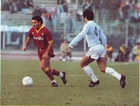 Proprio dopo Inter-Napoli, la gara che sicuramente interessa di più, oltre alla classifica, é il derby di Roma, che si torna a giocare in casa romanista dopo ben 4 annate (non accadeva dallo 0-0 del 11 novembre 1984, primo girone dell’ultimo anno in cui i biancocelesti retrocessero, mentre quello di ritorno si chiuse 1-1 con reti di Antonelli e Giordano) sapendo pure che all’andata, lo scorso 15 gennaio, i laziali si imposero con rete di Di Canio nel primo tempo tornando a imporsi sui rivali dopo 10 anni (l’ultima volta era stata Roma-Lazio 1-2 del 18 marzo 1979 mentre l’ultima occasionei n cui la la Lazio aveva vinto in casa era il 28 novembre 1976, con Giordano mattatore). Inoltre va detto che entrambe non ha già più impegni europei, visto che la Roma a dicembre era andata fuori dalla Coppa UEFA con un doppio 2-0 incassato dai semifinalisti della Dinamo Dresda (non riuscirà la terza rimonta dopo quelle contro Norimberga e Partizan Belgrado), e in Coppa Italia tutte e 2 hanno già ceduto il passo (i romanisti nel secondo girone dietro a Pisa, Ancona, Pescara e i laziali ai quarti dinanzi all’Atalanta futura semifinalista, che li ha battuti a Bergamo 2-0 per poi perdere nella capitale 3-2)…dunque, se la Lazio é molto vicina alla salvezza, la Roma si sta giocando le ultime chance di arrivare in Europa davanti ad un “Olimpico” che adesso sta ricominciando a contare tutti i suoi posti dopo mesi di lavori in corso per “Italia 1990” e che stavolta conta ben 70.000 persone di cui appena 20.000 “ospiti” bersagliati da sfottò insistenti e striscioni ricchi di ironia nel frattempo che gli scontri si susseguono fuori dallo stadio con un ingente dispiegamento di forze di polizia. I presidenti, Dino Viola e Gianmarco Calleri, arrivano in tribuna a pochi minuti di distanza cercando di trovare tutti i lati positivi possibili di una sfida come questa: per Calleri é il secondo derby ma il primo in trasferta mentre per Viola é il settimo (bilancio di 2 vittorie: una in casa in coppa e una da ospite in campionato, oltre a 3 pari di cui 2 casalinghi per poi chiudere con la delusione dell’andata che aveva innescato la crisi definitiva dei suoi)…in panchina, invece, vediamo il ritorno di Nils Liedholm, licenziato alla diciottesima settimana (dopo la sconfitta casalinga 1-3 col Pescara) e richiamato alla n.23 per riprendere il posto del duo formato da Luciano Lupi-Luciano Spinosi (2 sconfitte e 2 pari per loro) mentre dall’altra parte c’é Giuseppe Materazzi (padre del futuro campione del mondo nel 2006 Marco) che finora ha soddisfatto tutti al primo anno con il club delle “aquile”. Se la Roma si sicheira 4-5-1 a zona in cui figura Massaro sulla destra non adoperando marcature fisse e rinunciando al terzino Tempestilli col regista Andrade e l’ala Conti (tutti infortunati), la Lazio adoperare un offensivo 4-4-2 a uomo con Di Canio all’ala destra pronto a dare manforte al tandem Dezotti-Sosa mentre Acerbis garantirà l’equilibrio in un complesso privo del libero Marino, il centrocampista Pin (degenti) intanto che il giovane mediano Di Loreto é fuori per scelta tecnica; tanti, poi, i nomi importanti a livello internazionale: capitan Giannini era arrivato quarto agli ultimi europei dietro ai futuri vincitori dell’Olanda, URSS, alla Germania Ovest di Voller cedendo 2-0 in semifinale con i sovietici mentre Desideri aveva chiuso l’olimpiade sempre da quarto alle spalle di URSS, Brasile, Germania Ovest (saremo sconfitti 3-2 in semifinale dai sovietici e poi cadremo 3-0 contro i tedeschi nella finale di consolazione)…la prossima Copa America, invece, prevista nel periodo 1-16 luglio, vedrà coinvolti diversi effettivi a come il futuro campione in casa Portaluppi mentre Andrade sarà lasciato a casa, che batterà in finale l’Uruguay del duo Gutierrez-Sosa per 1-0 in un girone finale che vedrà coinvolti anche l’Argentina senza Dezotti oltre al Paraguay. Entrambe non navigano in acque felici per quanto riguarda i risultati, visto che i “lupi” hanno ottenuto 2 pari e una sconfitta nelle ultime 3 (1-1 con l’Ascoli e a Napoli prima di perdere 2-1 in casa Juve, con le ultime gioie rimediate per 1-0 con la Samp e a Como) al netto di una Lazio che non incassa gol dal 3-1 rimediato a Bergamo lo scorso 16 aprile…da allora 0-0 con il Lecce e a Pescara per poi vedere un doppio 1-0 in casa contro Pisa e Fiorentina.