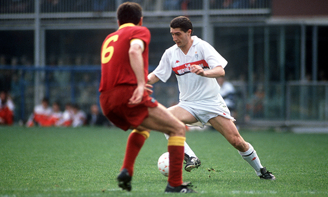 Viola è regolarmente al suo posto con lauto anticipo ma non verrà accolto bene dovendo accettare anche l’irritante scritta “PE COMPETE CO BERLUSCONI E PELLEGRINI CE VONNO LI SORDI DE GARDINI” (il patron di Enimont che morirà “suicida” 3 anni dopo a causa del processo di “Tangentopoli” che lo vide pesantemente invischiato) mentre Berlusconi dovrà raggiungere l’impianto scortato per non avere problemi; gli allenatori Radice (ex di giornata come il bomber Massaro) e Sacchi si presentano con i migliori schieramenti possibili cercando di mettersi i bastoni fra le ruote reciprocamente…per entrambi un 4-4-2 agli ordini di Pairetto ma, nel I° caso schema difensivo e di copertura, nel II° offensivo e di creazione: