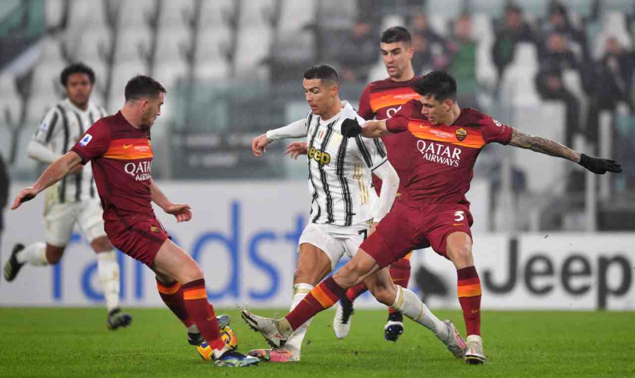SECONDO TEMPO – La ripresa segue lo stesso copione: Juve in attesa e ripartenza, Roma che cerca di rendersi pericolosa, ma i tiri in porta latitano. Al 58’ tiro-cross di Spinazzola che passa non lontano dalla porta juventina. Alla mezz’ora della ripresa Fonseca rivoluziona la squadra con tre cambi: via un opaco Villar per Diawara, entrano anche Carles Perez per Cristante e soprattutto Dzeko, che torna in campo dopo le settimane in tribuna per i dissapori con il tecnico, al posto di Mayoral. Cambi anche per la Juve, con l’ingresso di Cuadrado e Kulusevski per Morata e McKennie. Al 67’ pericoloso Carles Perez, che tira al volo dopo uno scambio volante proprio con Dzeko: parata di Szczesny. Al 69’ la Juve improvvisamente raddoppia: giro palla, cross di Kulusevski, e Ibanez in scivolata insacca nella sua porta nel tentativo di anticipare Ronaldo.