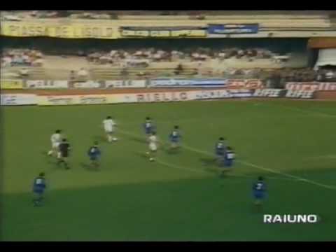 Alla ripresa delle ostilità comandate dal romano Longhi si vede che il Verona ci mette tanta buona volontà ma il Napoli ha decisamente una marcia in più: siamo al 51° quando Magrin stende Carnevale in area prendendosi il cartellino giallo e decretando il rigore dello 0-2 che Careca realizza di destro incrociato spiazzando l’incolpevole Peruzzi (prima segnatura per entrambi i goleador di giornata: le altre 2 di Serie A erano state di Crippa e Renica mentre in coppa nazionale erano andati a segno Carnevale, Zola, lo stesso Renica)…Carnevale potrebbe triplicare con un bel destro a giro ma non chiude troppo la conclusione intanto che le segnature si susseguono su tutti gli altri campi senza dare troppe sorprese; ormai è il 62° e sembra che si possa solo vedere scorrere il tempo rimanente fra azioni confuse dei veronesi o ripartenze fin troppo poco incisive da parte dei napoletani mentre Crippa/Baroni e capitan Fanna si aggiungono ai cattivi ma non è ancora finita: da una confusa mischia in area azzurra andata in scena al 62° il rude libero Gutierrez (arrivato in estate dalla Lazio) riesce a concludere in rete di destro al volo per l’1-2 che riapre tutto (2° timbro per lui…gioia solo personale) spingendo Bagnoli a inserire Acerbis (altro ex laziale) assieme a Gritti per Gaudenzi/D.Pellegrini al netto di un Bigon che cerca di tenere invariato il suo schieramento fino all’ultimo senza cedere agli attacchi nemici neanche quando Iorio costringe Giuliani a bloccare in tuffo un bel colpo di testa in seguito ad un ottimo destro spentosi sull’esterno della rete da un’altra mischia. Nei minuti conclusivi assistiamo all’entrata di Corradini per Careca (tornato dalla Copa America, vissuta da spettatore, senza neanche essersi fatto giorni di vacanza e, dunque, in condizione ancora troppo scadente) a difesa strenua del risultato tramite un 4-5-1 chiaro e gli uomini in maglia bianca tengono durissimo consolidando la vetta a parità con la Juventus con il solo rimpianto di aver subito il 1° gol dell’annata (in cioppa solo il Monza li aveva bucati nel 2° turno costringendoli ai rigori: vinceranno 10-9 pur avendo maturato l’1-1 sul campo).